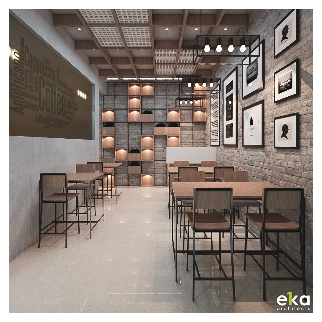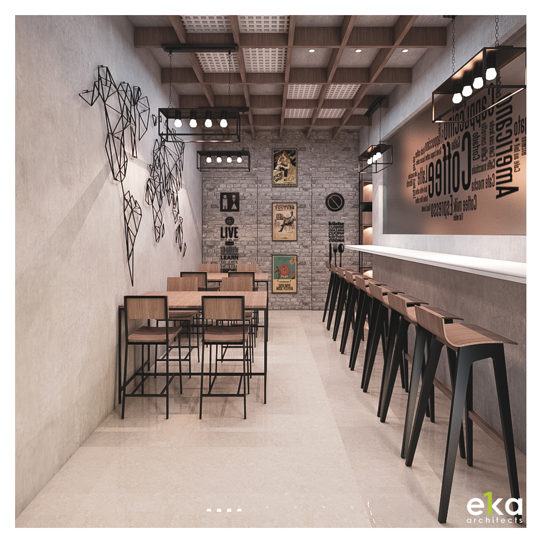 Interior Design & Execution of a cafe designed with elemental interiors & rustic finish.